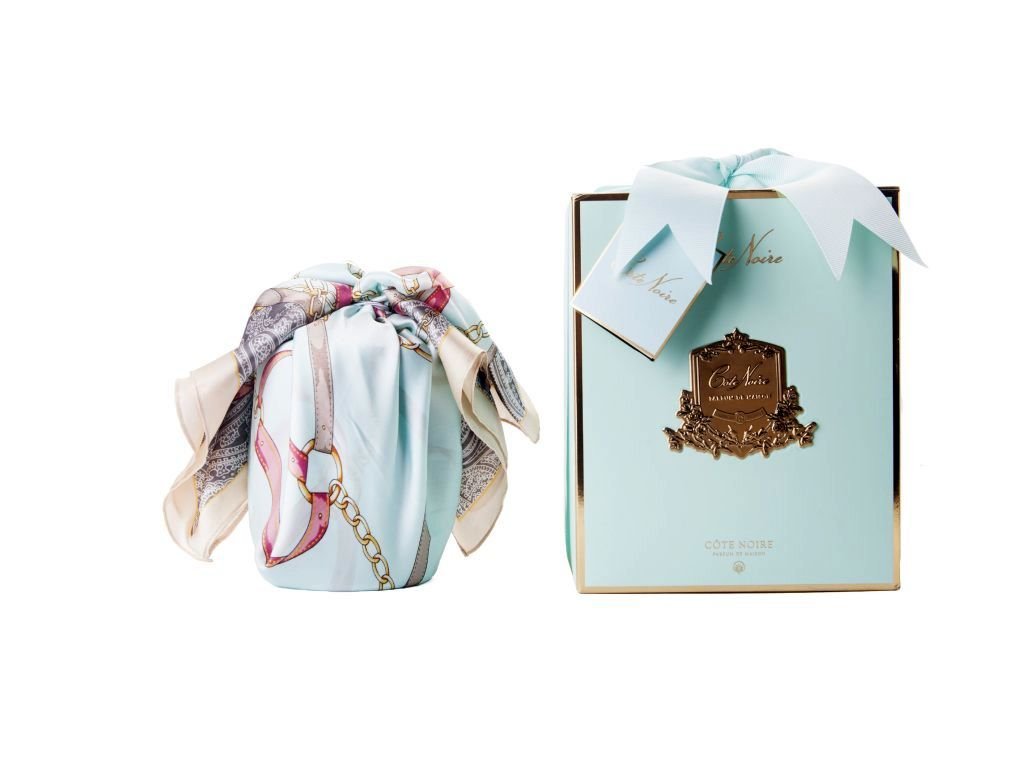 Côte Noire Herringbone svíčka se šátkem – Tiffany Blue & Gold s víčkem Butterfly 🦋✨