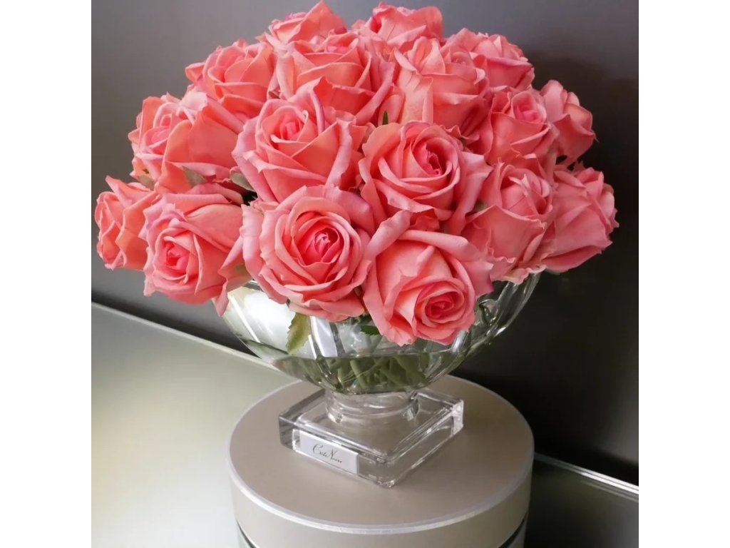 Stylová váza: Těžká skleněná nádoba se čtvercovou základnou a stříbrným kovovým znakem podtrhuje exkluzivní vzhled celé kompozice. 🏛️