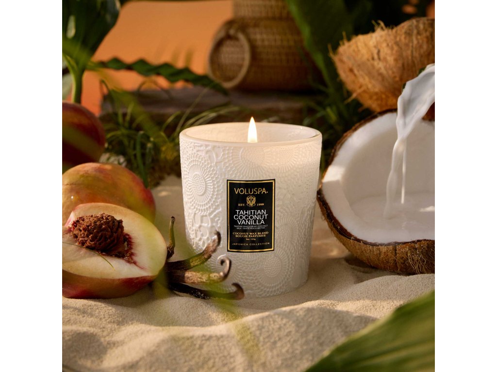 Svíčka Voluspa Tahitian Coconut Vanilla – Classic Candle je vyrobena z exkluzivní kokosové voskové směsi, která zajišťuje čisté, stabilní a rovnoměrné hoření. Vůně propojuje jemné kokosové mléko s tahitskou vanilkou a sladkým bílým broskvovým nektarem, doplněnými o lehký květinový nádech. Výsledkem je smyslná, uklidňující a zároveň svěží parfemace, ideální pro každodenní relaxaci.